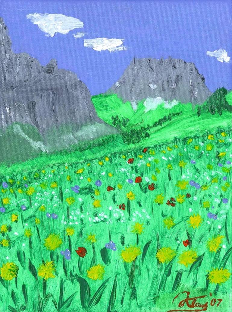 View of a high mountain meadow, at a bee's level, enjoying vivid colors and clean air in the mountains. Also present at the Laives (BZ) International Competition / Exhibition in November 2007. Also featured in the 2010 art calendar. Present at the "1. Premio Internazionale Pitturiamo" at Palazzo Xim...
