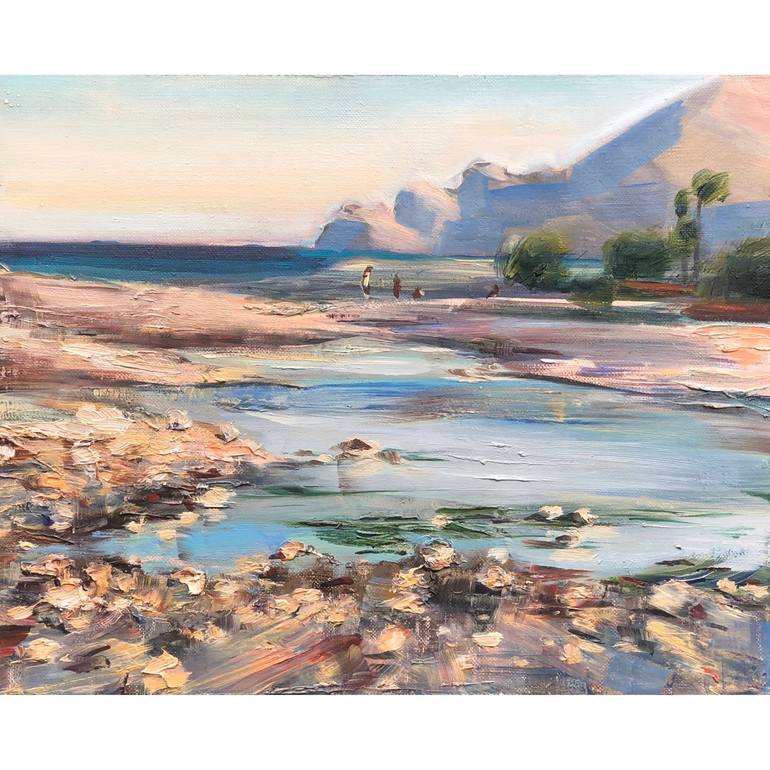 I love working plein air - it gives me true sense of the moment. This work was painted on a spot just before the sunset. I was inspired by the soft peach and turquoise colours of the sunset and the rhythm created by the rocks on the beach. It was also a rather crisp windy day. Next to me two geese w...