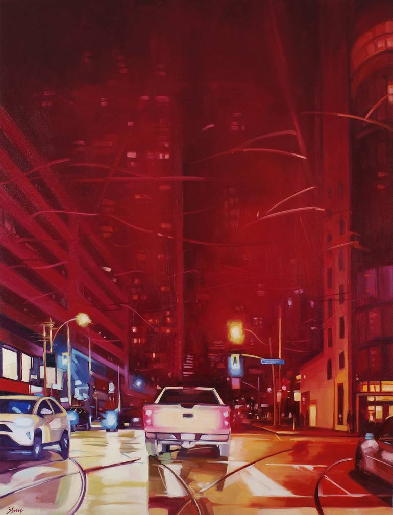 A painting series of Toronto streets at night. The glowing buildings in multiple shades of colors. Cars speed along with people walking on sidewalk. Bright reflecting lights from artificial city structures. The beauty that is easily overlooked and passed by.