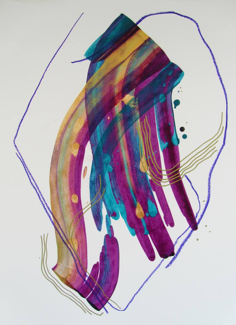 24" x 18" mixed media on 140lb acid free archival paper.  Feathering streaks of purples, blues, and gold lay beneath a delicate application of metallic gold lines and purple oil pastel.
