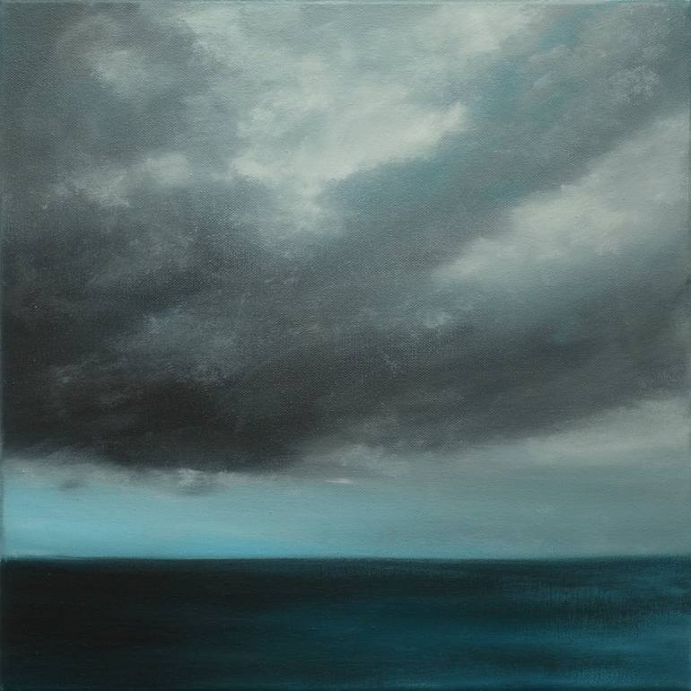 Am Meer 18 - 2022 - Oil on Canvas - 38 W x 38 H x 3,5 D cm. "Am Meer 18" depicts a dramatic and atmospheric seascape. The focus of this picture is entirely on the natural elements of water and air. The canvas is stretched on a wooden frame and the edges are painted white so the art is ready to ha...