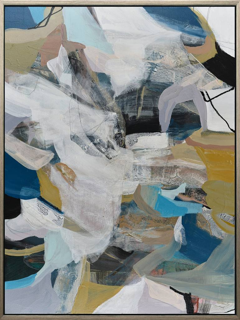 I’m an explorer on the canvas. Layer by layer, I build and subtract—painting, drawing, scraping back, and then adding more. From a distance, my work offers bold, graphic forms; up close, viewers discover rich organic textures and intricate details. I’m drawn to contrasts—light and shadow, vivid hues and muted tones, smooth and rough surfaces, angular and curvilinear shapes—mirroring the interplay of strength and delicacy I see in both nature and ourselves. I strive to reflect this tension in my work: the strong and the soft. My process combines oil, hand-painted collage, acrylic, graphite, and oil stick. Inspired by Franz Kline’s idea of automatism—what he called “pouring out” before editing—I begin with an automatic drawing in graphite and wax crayon. Translucent layers of paint follow, interspersed with further mark-making and additional layers, building a visual language that evolves organically. Painting is a deep dive act that happens within oneself, with a goal of pulling out something beautiful for the world to connect with. This has become even more important to me since an early diagnosed breast cancer was resolved, leaving me grateful and even more focused and motivated. Everyone has gifts from the Creator. I believe it is the duty of each to share our gifts with the planet. My paintings are a brave look inward – revealing what lies beneath both literally and spiritually. Yogis call it the “divine flame” – the spark that motivates you in life. In Buddha’s words, “Look within, thou art the Buddha”, while Jesus taught us that “The kingdom of heaven is within you”. For me, painting is the most life affirming thing to do.