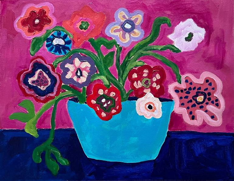 A work on canvas paper that will need to be framed to be hung on a wall. A colourful still life exploring form and motif.