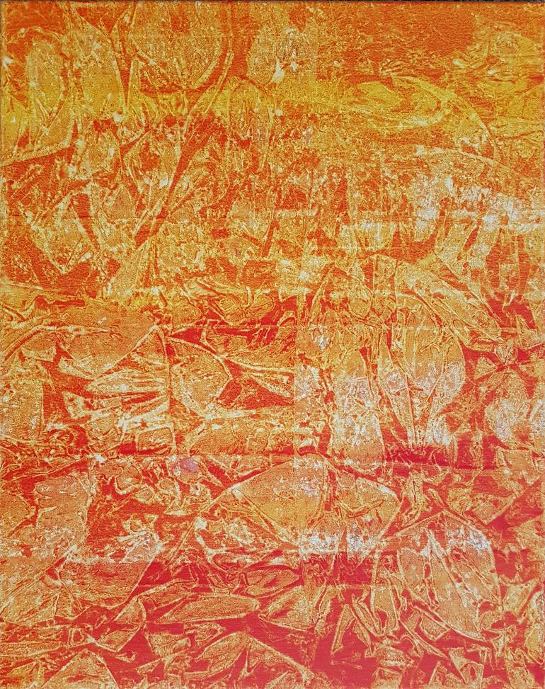 Abstract impression of a rock face ba[hed in orange setting sunlight. Multiple glazes used to create impression of depth.