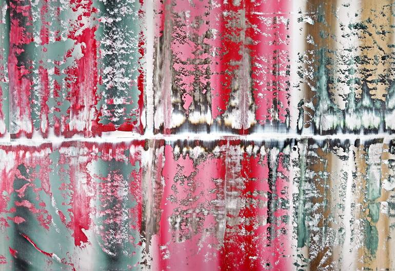 This striking abstract artwork captivates with its vibrant interplay of colors and textures. Dominated by bold strokes of red and pink, the canvas exudes energy and movement, punctuated by splashes of contrasting teal and earthy browns. The central horizontal divide, marked by a black and white grad...