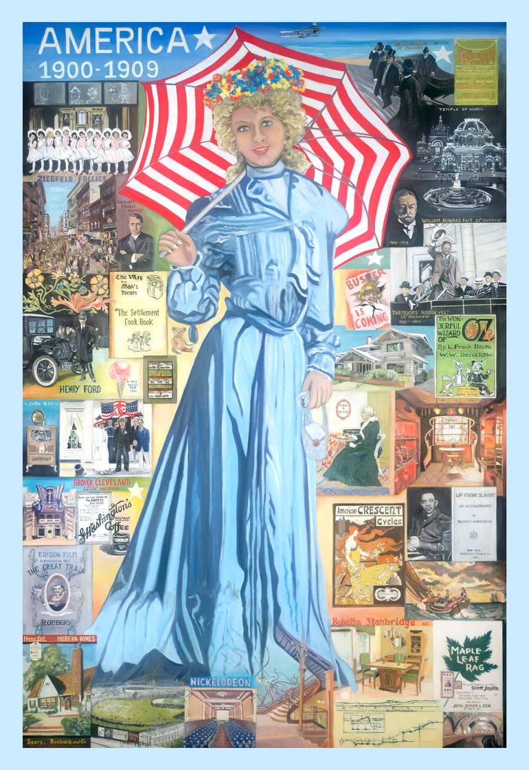 4 x 6' oil painting on masonite. First montage in the series of American Pop Culture in the 20th Century.