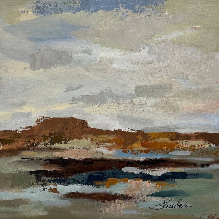 A small landscape inspired by the American west and the muted earthy colors of the high desert. Painted with bold brush strokes and palette knives. It can be displayed individually, as a part of a gallery wall or as a pair with its mate American West II.