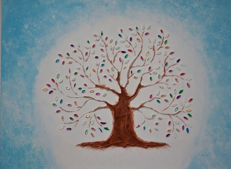 This is from a series of trees ranging from 8'x8" to 36"x48" all are unique 1 of a kind and colorful. Each one was painted with the feeling of joyful lightness.