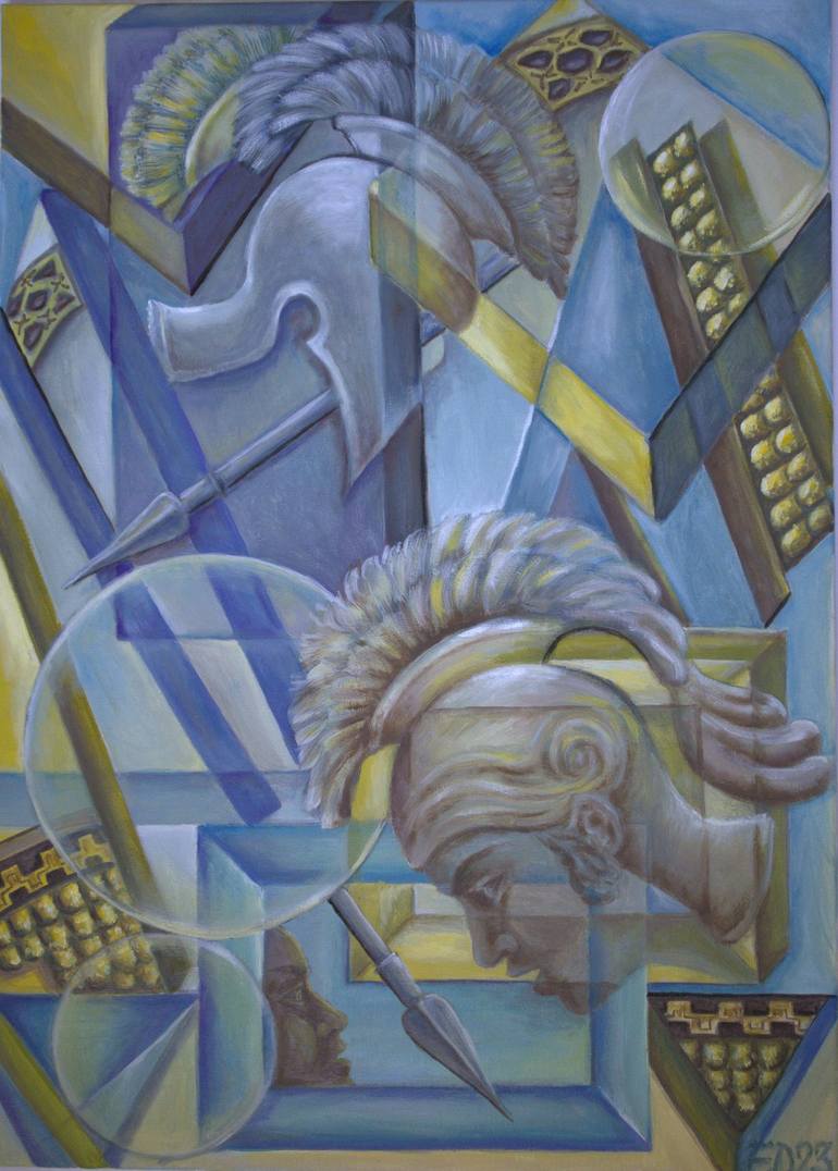 In this picture among the "bricks of history" and faded paintings you can see ancient tools of the warriors of the past. The head (which would be the Achilles head) that looks into the face of its own death, as in the mirror but has already become the earth... Dust to dust...
