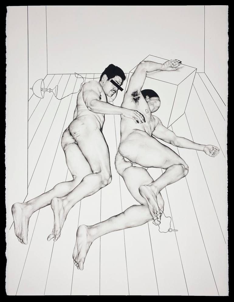 Felipe Chavez is a figurative artist born in Colombia, now working and living in London, England. Through his paintings created with Indian Ink wash on thick 638gsm HP paper, he uses his own body to explore the male form and his’ relationship with sexuality and the space around him. Arriving to the UK at the age of 17, he lived in a small apartment in north London with his mother, who worked several jobs and often took felipe to assist her. Shortly after arriving, He enrolled into an art college course but due to his limited emigration status, he was unable to continue his art studies into higher education and decided to pause his art practice to direct his attention in building a career within a different field,. Felipe restarted his artistic pursuit at the start of 2018 with his first group exhibition in an East London cafe. but balancing an artistic career whilst also working in a demanding formal job during the day was not easy. since then, his ever growing self-taught artistry, commitment and passion have allowed him now to fully dedicate his time to the practice of art. He currently works primarily with galleries and art dealers based in Paris, Miami, Boston and Portland. Through these partnerships, he has also showcased his paintings in several art fairs and sold to many well-known collectors. It is With his conceptual and honest self-portraits, alongside a consistent self experimentation, he invites the viewer to engage with his physical introspections where he studies the layers of identity and belonging.