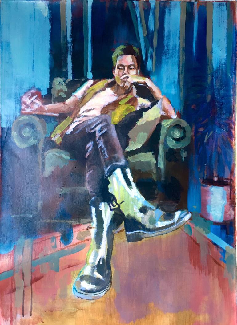 Portrait of a friend I made whilst living in Barcelona, he was from Manchester, England and is an aspiring Poet. He sat in my apartment in the chair he is in in the Painting reading some of his work to me and I sketched and photographed him as he did. The painting evolved I intended it to be much mo...