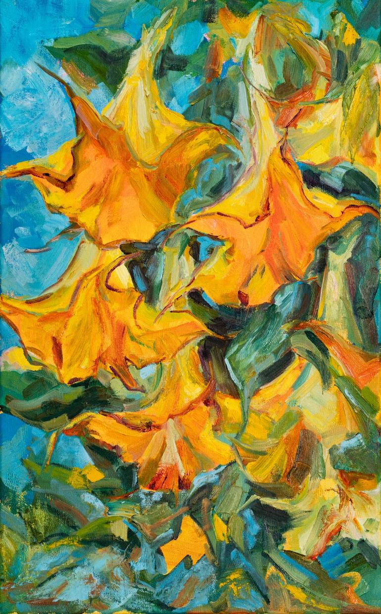 Original "Angel Trumpet Flower" painting on canvas by a brush and palette knife A good idea to give a touch of floral taste to your home, living room, kitchen, bedroom or office…perfect gifts for your relatives and friends *Title: Mimosa *Size Painting: 32"x39" (100x81 cm) (On request I can paint th...