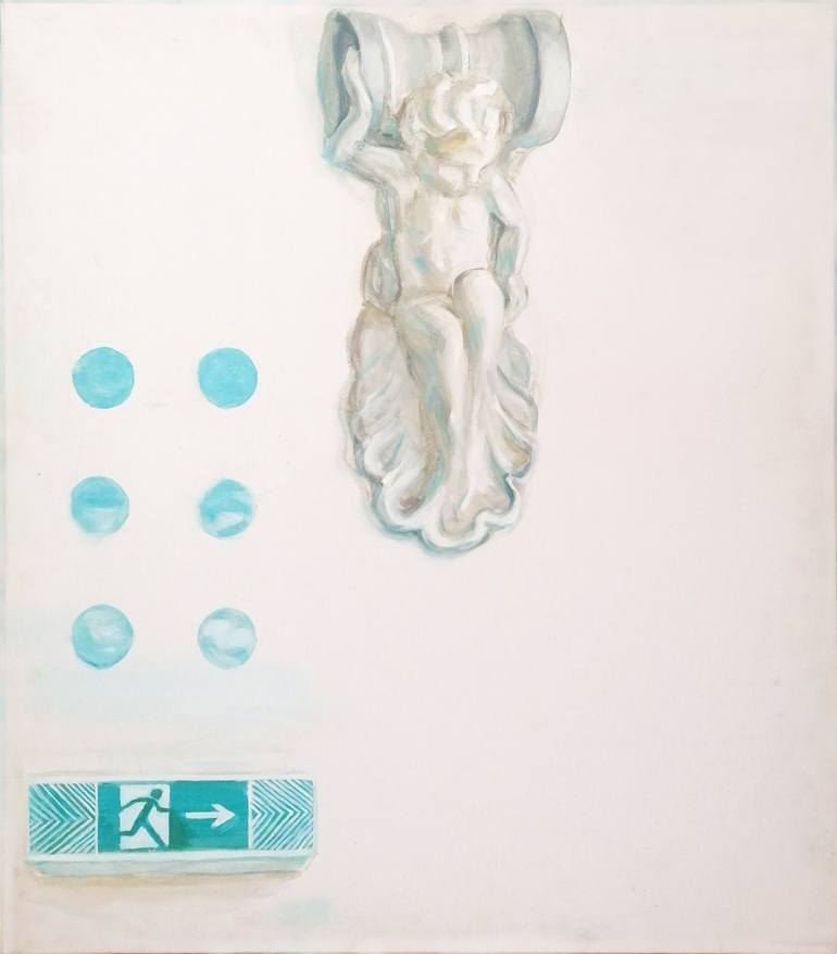 A guarding angel waiting at the exit, allways at your disposal to save and lead you in any sutuation. Not meant in a religious sense, this is rather a metaphor an has just a symbolic meaning. This is a real architectural fragnement I saw once at a hidden place in Vienna.