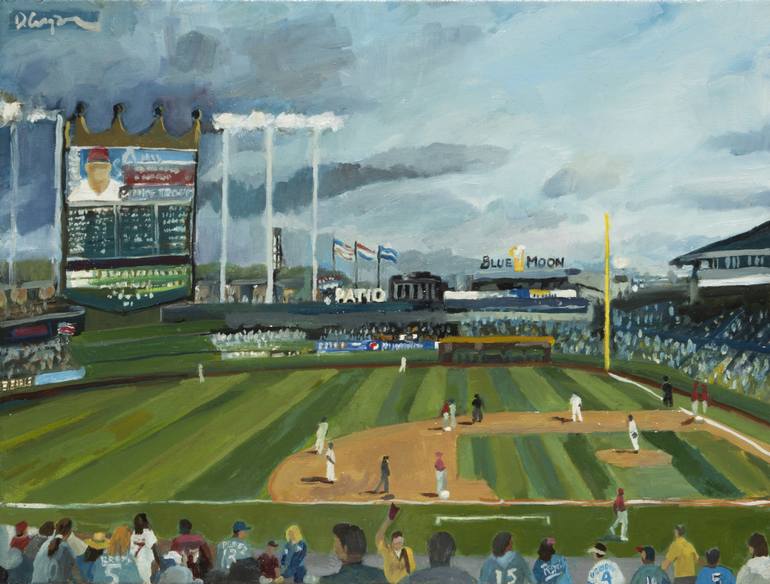 April 27, 2019 the Los Angels Angels played the Kansas City Royals. In the first inning Mike Trout doubled in Kole Calhoun from second base. Score Angels 1 - Royals 0. The next three batters walked and the bases were loaded for Albert Pujols. This painting was the scene of that at bat. The sky was c...