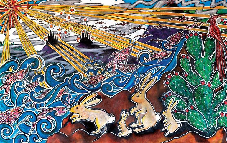 Alison Dale is a painter and mixed-media collage artist from Santa Fe, New Mexico. She uses embodiment processes like breathwork and singing to engage with the unseen world, and channels these messages into provocative artworks that challenge how humans see themselves within the more-than-human world.