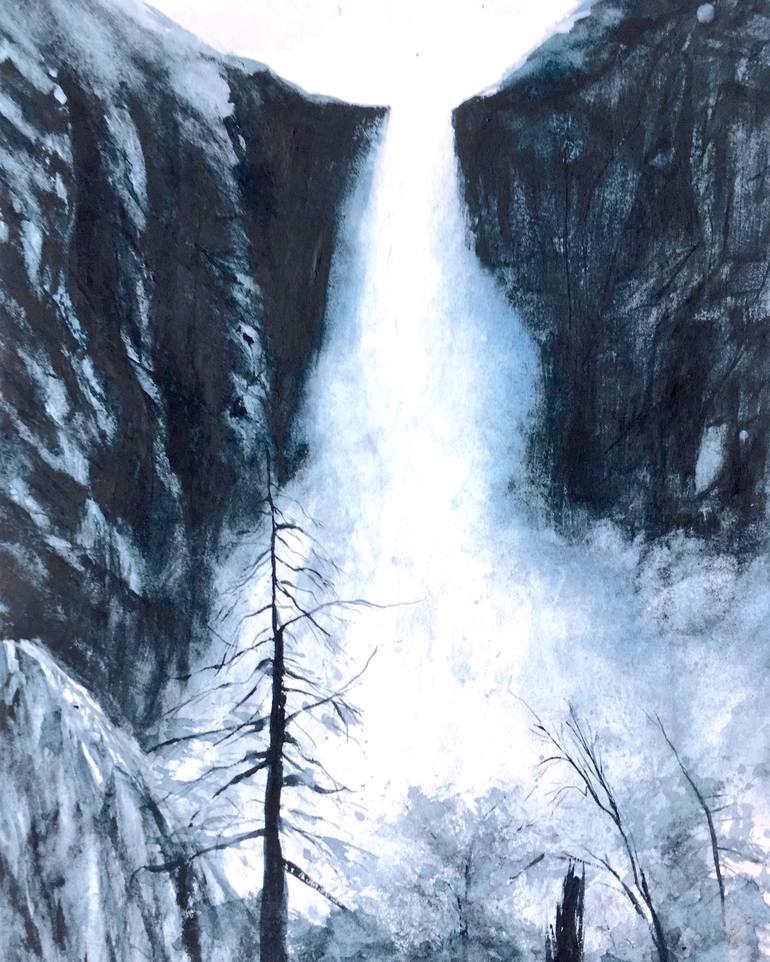 A watercolor painting inspired by an Ansel Adams photograph of Yosemite, this is a realistic waterfall painted with ground up minerals. It is both peaceful and filled with nature's force. It would work well in many styles, as it is a neutral monochromatic indigo color and white.