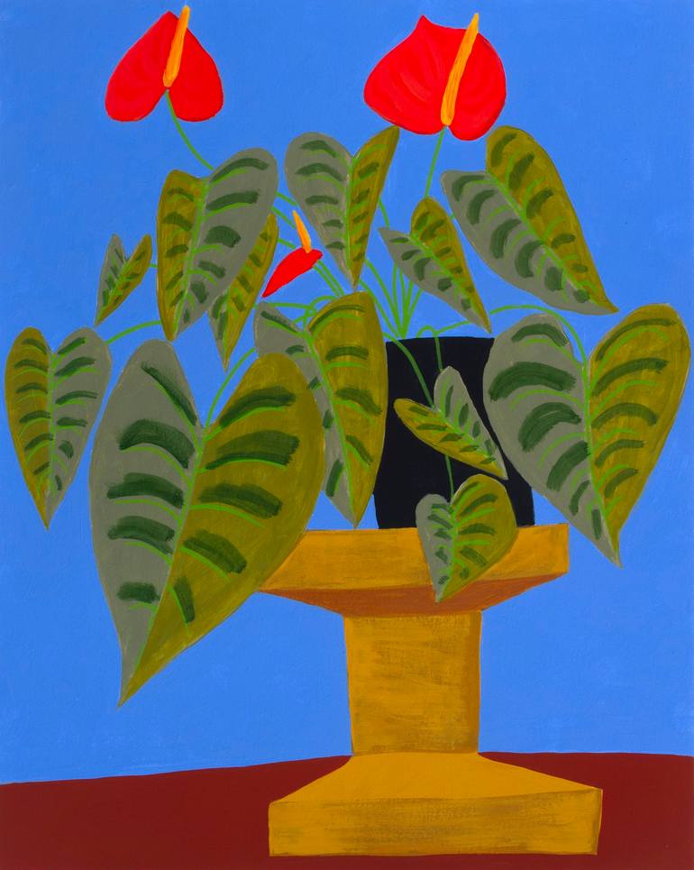 Acrylic and flashe painting on heavy-duty watercolor paper, 20 x 16, Signed, dated, and titled on the back. Unframed. Flashe is a matte vinyl-based paint. From a continuing new series of still-life interiors. A blooming anthurium plant sits on a cork stool.