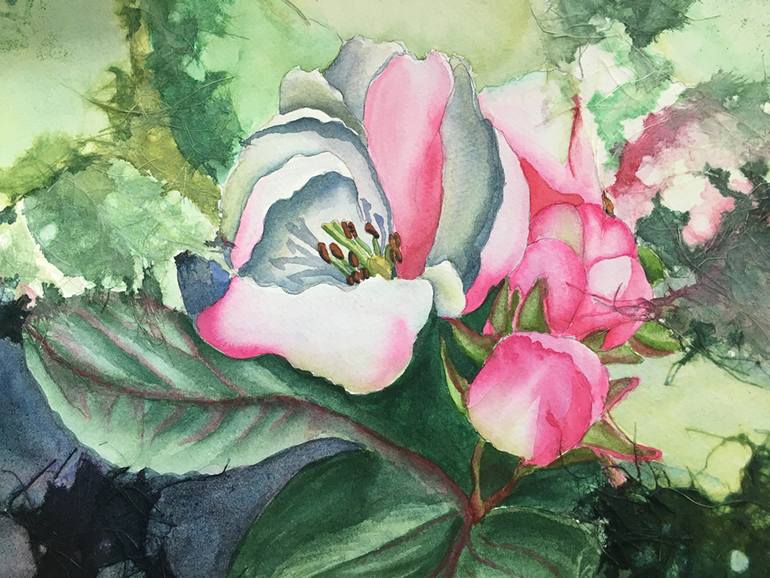 The apple tree in my yard comes to life every spring. The process from flowers to fruit is always fascinating to watch. This piece captures that evolution with added textures from Ogura Japanese papers painted in the background.