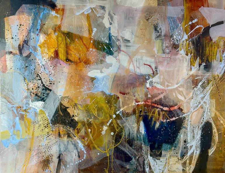 This luminous abstract painting exudes warmth and vibrancy, with layers of golden ochres, soft whites, and rich blues interwoven in a dynamic, textured composition. Expressive splashes and intricate marks bring an organic, spontaneous energy, while delicate transitions between light and shadow add d...