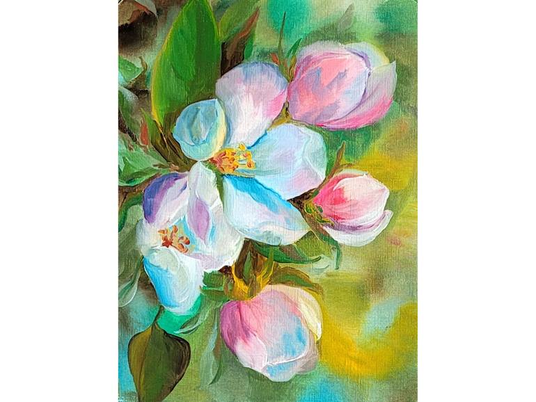 This is my original art, hand-painted oil on canvas, floral painting original. It is signed in the backside and lower hand corner. This apple blossom painting from the my contemporary flowers paintings collection 2022 year.