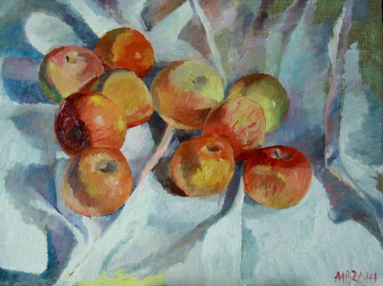 This series, Albeniz's Apples, was completed in April, 2014 between two month long landscape excursions. The series was meant to keep me loose and thinking about color while I was between excursions. The wood panels they were created on had been painted a few years earlier and the sanded down pain...