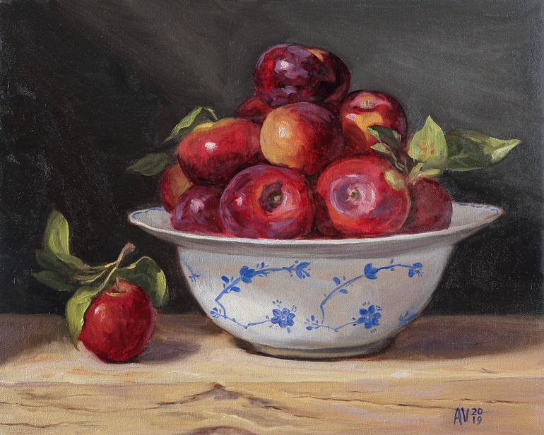 Title: Freshly picked apples in a white bowl Painting Dimensions: 16"x20" Medium: Oil on canvas Type: Original art, only one available. Framed: No We try to go apple picking every year, and this year didn't disappoint. We came back with loads of beautiful apples that filled the house with their fr...