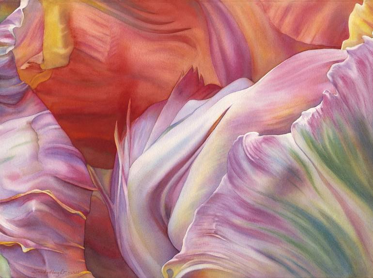 As the Skagit County tulip Festival poster artist for 2016 I photographed the rich variety of tulips in the gardens at RoozenGaarde. The Apricot Parrot tulip grabbed my attention with its frills and color gradients and its hodgepodge of petals going every which way. As I zoomed in on the inner bloom...