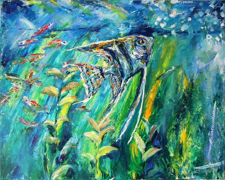 Aquarium With Wild Altum Angel Fish Mixed media on canvas Size: 100 x 80 cm ( 39.3 x 31.4 in ) Animal / Aquarium Artist: Vjeran Čengić / Cro. Figurative Expressionism 2018. - - - - - - - - - - - - - - -