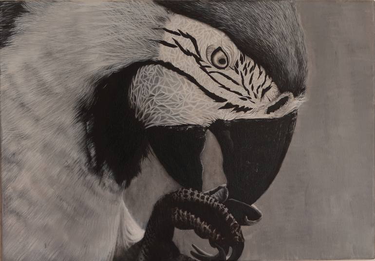 this work was carried out on an already prepared extra-fine cotton support, and executed in oil on canvas only with the use of white and black, depriving the subject of its aesthetic beauty, the color.