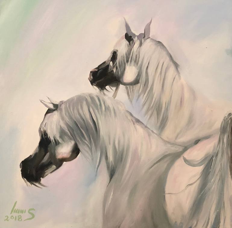 An original oil painting for an Arabian horse and its beauty. Painted by Lamees Alhassar. Author, artist and humanitarian.