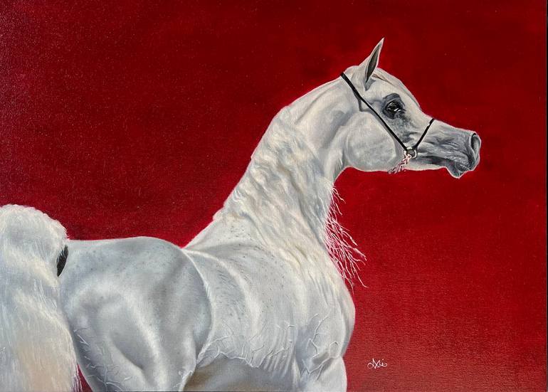 In the painting, a stunning Arabian white horse stands majestically against a vivid blood-red background, creating a striking contrast that captures the viewer's attention. The horse’s coat glistens like polished ivory, its sleek form embodying grace and strength. Delicate lines accentuate its power...