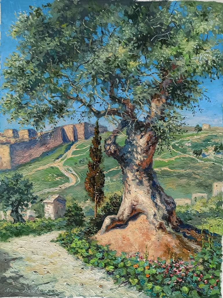 I inspired by the beauty of Jerusalem, especially Garden Gethsemane, where we can find only Olive trees He will feel the all inspiration, which I felt during of painting this canvas It's very comfortable size and the realism is helping to open the all beauty of the landscape