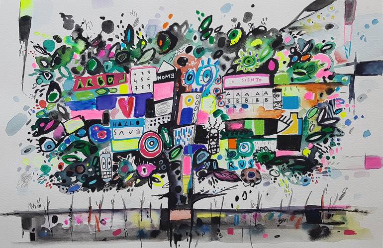 Desde el punto de vista tècnico esta pintura está realizada con acuarela, acrílico y rotuladores, ya que se combinan diferentes materiales para dar gran riqueza matérica a la obra. La obra representa los diferentes momentos de incertidumbre que nuestra sociedad esta viviendo, es un cuadro narrativo...