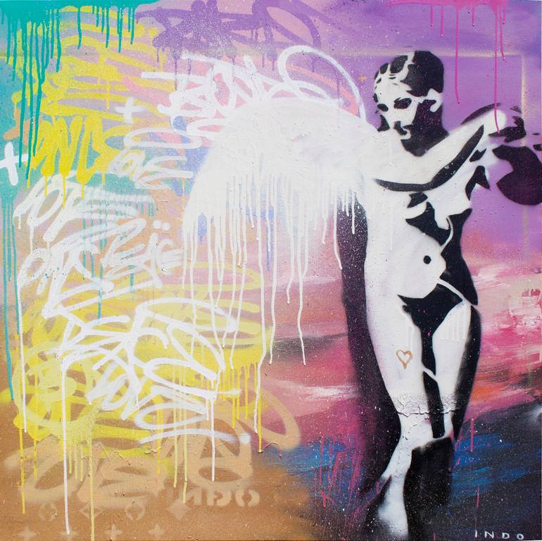This captivating artwork, titled "Earth Angel", is a vibrant fusion of urban street art and delicate symbolism. The piece showcases a striking stencil-style figure of an angel, rendered in high-contrast black and white. The dripping, ethereal white wings create a sense of motion and fluidity, symbol...