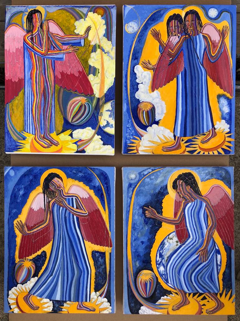 The story that informed this work: one evening i was in bed and i asked God what to paint and He says: "the four angels";i know it is found in the bible "Revelation 7".These archangels are standing at the:East, West, North & South; holding back the winds of strife from destroying the earth.Oil i...