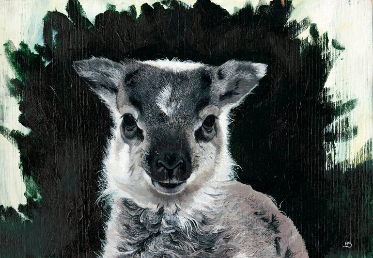 Oil paint on wooden board of a Soay ram lamb in Cheshire, England.