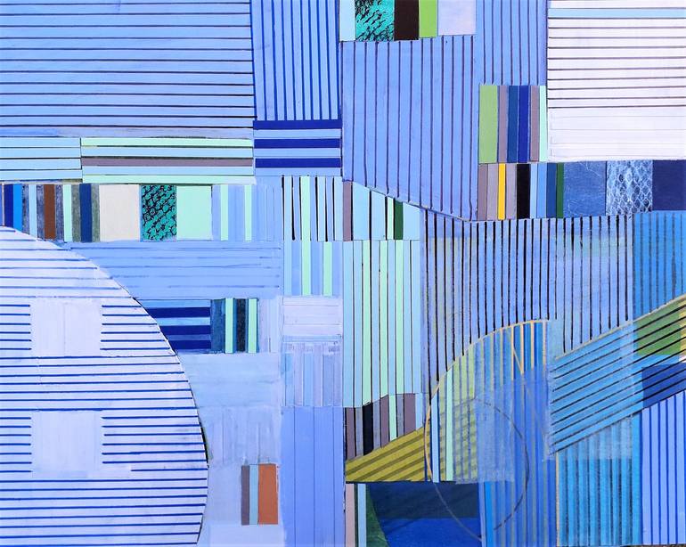 A mixed media painting on wooden panel board , use of acrylic paint and paper, layers of Varnish. The blue colour is essential in this painting, the feeling of an arctic winter, a touch of green, grey and white. Certificate of authenticity Original artwork