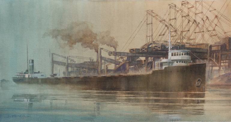 Pictured here, the Great Lakes freighter, The Arcturas. It's massive hull glides gently along the smooth surface of the river, reflections shining up even in the mist.