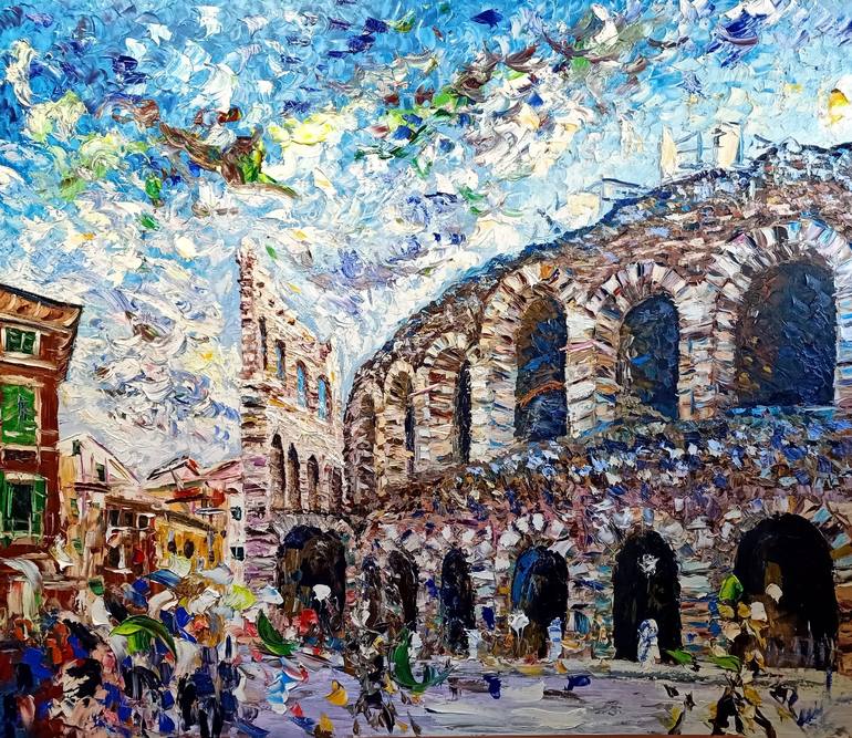 Title: Arena in Verona Dimensions: 140x160 cm Year: 2024 Technique: Oil on canvas with palette knife Frame: Not specified Antonino Puliafico’s "Arena in Verona" masterfully captures the grandeur and timeless charm of one of Italy’s most iconic landmarks. Through his signature palette knife techniqu...