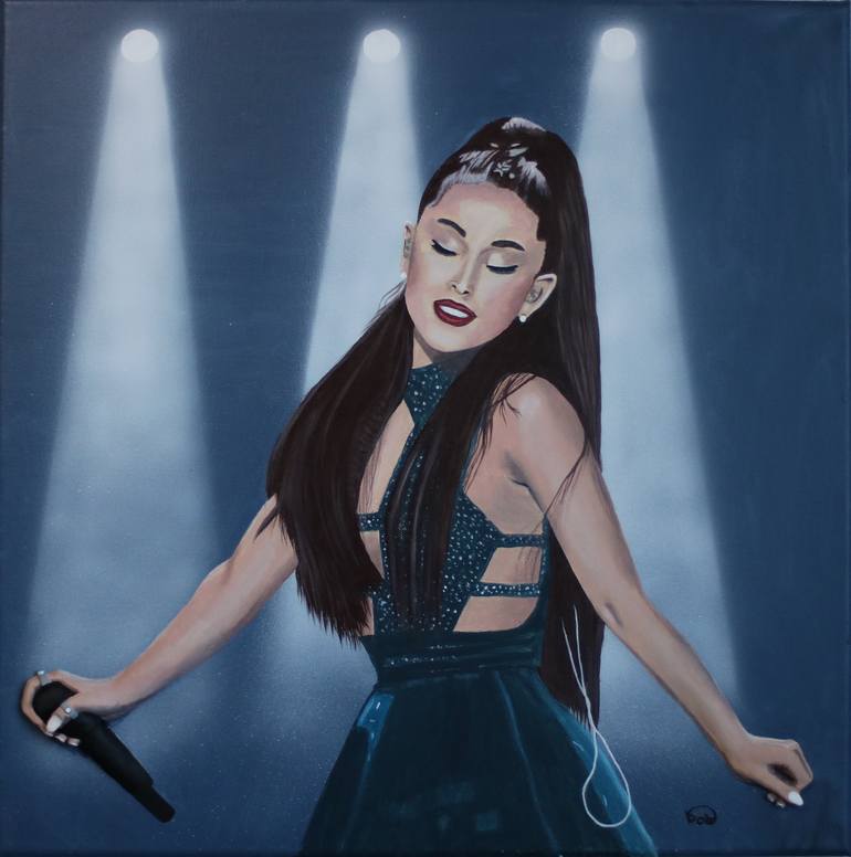 This female singer needs no introduction. This pose elicits her feeling at the peak of happiness on stage, mic in hand, in a beautiful blue dress and long dark hair. Stage lights illuminate the background. Her hands literally emerge from the canvas. Parts of the image are sculpted on top of the sub...