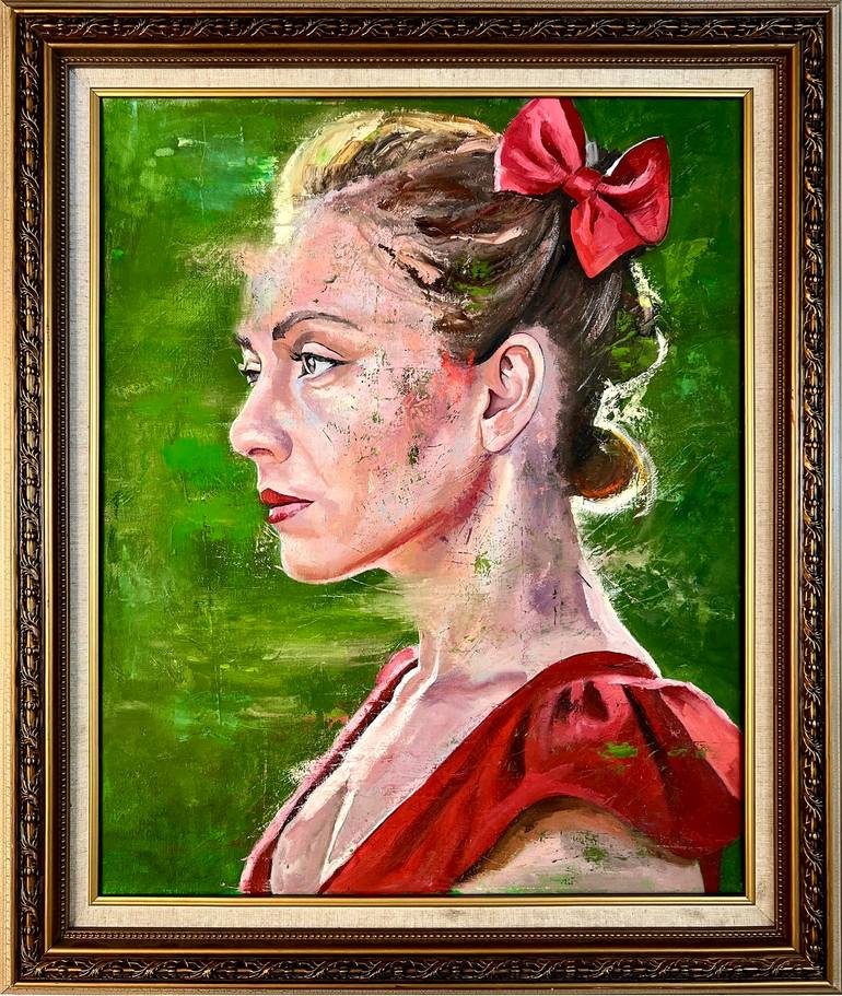 "Aries" captures the poised strength and elegance of its subject, framed in a vivid contrast of red and green. This oil painting showcases a woman in profile, her intense gaze set against a textured, emerald backdrop. The detailed red bow and dress add a vibrant focal point, highlighting her determi...