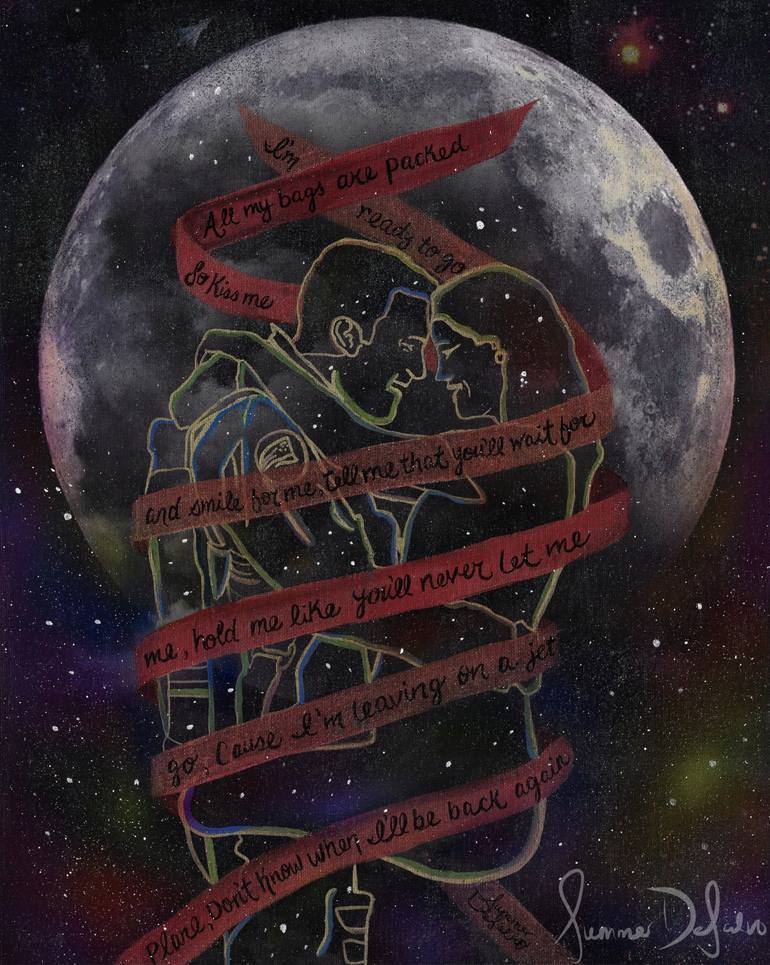 This mixed media piece was inspired by the movie Armageddon and the famous scene when they’re about to depart to save the planet. “Leaving on a jet plane” plays in the ribbon that wraps around they’re last good bye. The background was created digitally while then printed onto canvas paper and painte...