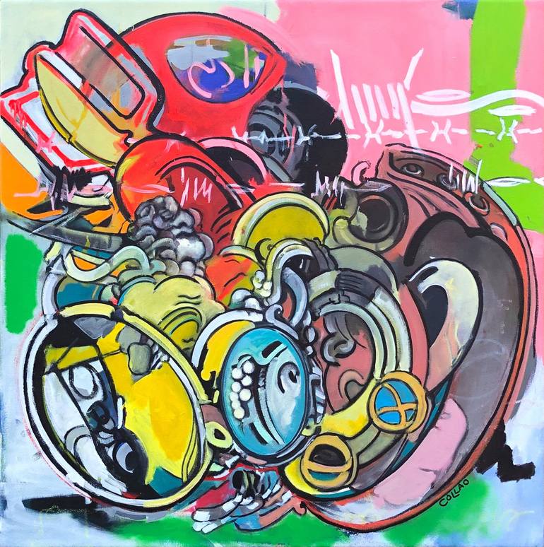 Painting for me has always been a non-verbal language that I do not always know clearly what I want to communicate, but I have always felt the urgent need to do so. My process when working is alone and daily, nourishing myself with my own imagination, which allows me not to subordinate myself to a single form, I like to invent new images and scenarios, my own experiences or those of others give me ideas, I always face the canvas in white with no project in mind other than to continue, stain and thought merge into one, I have no planned answers, the path is full of multiple changes of direction, many hours of contemplation, decisions and actions, I limit myself to suggesting and not forcing an objective, guided by instinct in the first place but always trying to find the perfect fit between the solution and the intention, a search that I also try to achieve through emotional sincerity, color channels emotion, I think of colors and the drawing contains while providing different readings, I like to take the viewer's eyes from one place to another on the canvas without discovering everything immediately. My painting deliberately proposes a state of tension between the visceral and the mechanical and juxtaposes the industrial with the habitable, reflecting the contradiction so typical of the urban environment, articulating a story based on the historical tension between abstraction and figuration, a tenuous interval between the figurative and the abstract creating an imaginary space that configures itself through the proposal of a language inherited on the one hand from academic training and on the other from the representation systems of comics, graffiti and science fiction cinema.