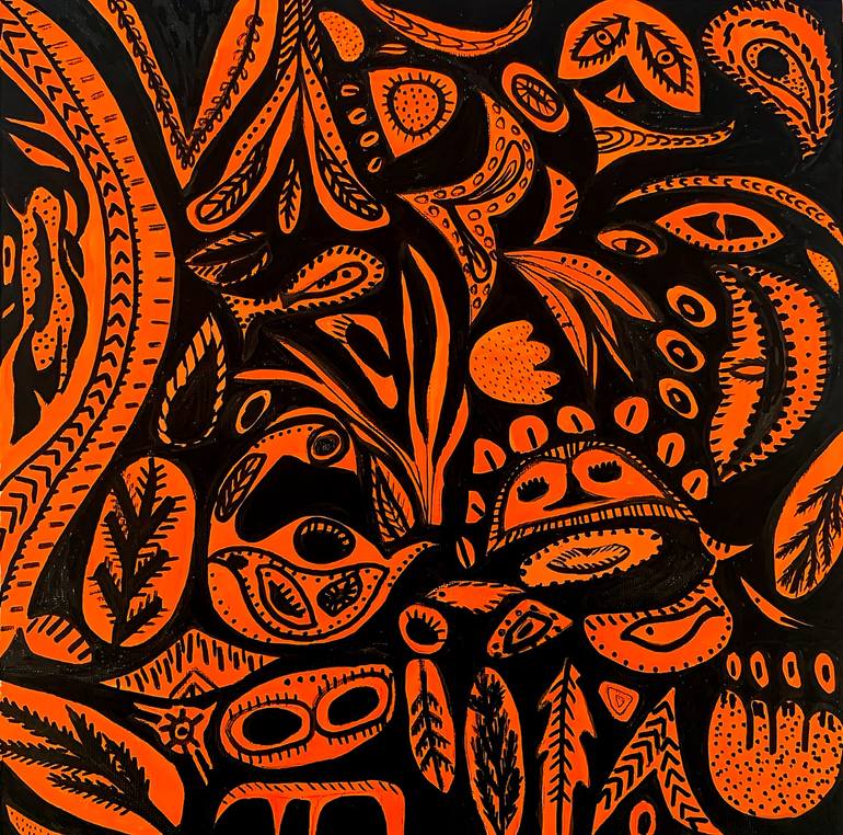 "Around Us" is an abstract exploration of the organic patterns, hidden emotions, and unseen energies that shape our world. Bold black lines weave through vibrant orange forms, creating a dynamic composition reminiscent of nature, movement, and the subconscious. The intricate details invite the viewe...