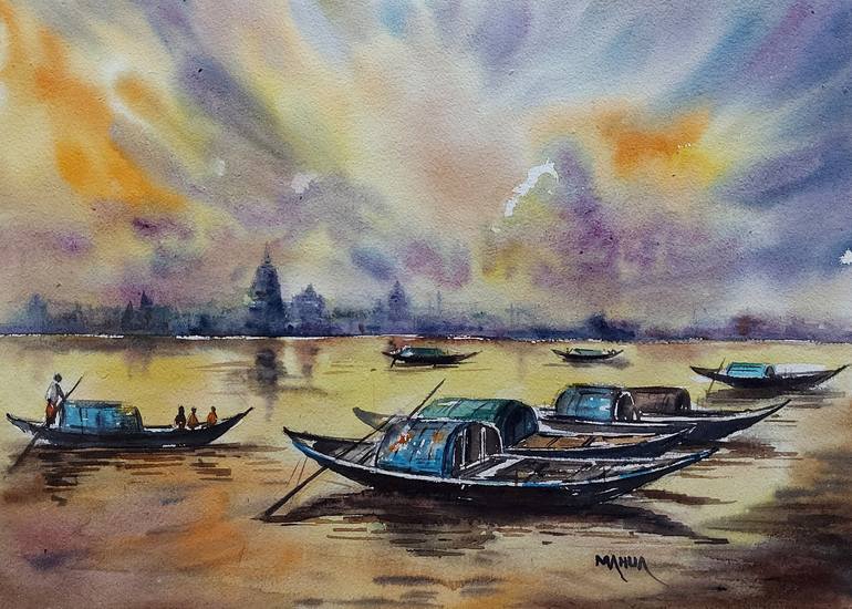 Who does not enjoy the arrival of a new day, a new dawn? It brings with it hope and vigour! This water colour on Paper Landscape Drawing Depicts a typical river scene in India where fishermen are up early to haul the fresh catch of the day as the sun gradually rises in the horizon, a ethereal sight ...