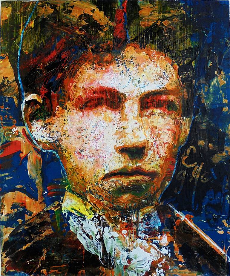 Rémi Jouandet is a painter working in Valence Drôme, France. For collectors he is one of the best kept secrets outside France and Canada. However, it is quickly changing, and it is all to do with his semi-abstract portraits. See in the not-too-distant past art critics felt uneasy about dealing with portraits of celebrities. Particularly, in the days when the novelty value of Warhol’s serial ‘Marylins’ wore out, and art had to shock, and teach us to abhore beauty. For the record, either one end of the polarised scale is justified by us — as is everything in-between. But then entered Elizabeth Peyton, a reputable, and formally trained artist who defied the prevailing dogma and championed the celebrities. Along with her exagerations came increasing focus on high-gloss cult images in the tabloid-media. Arguably, with Peyton’s and Jouandet’s work, there is a fine line between offering something kitsch, and adding some other dimension. Jouandet’s work falls into the latter category with the caleidoscopic feel he adds to each piece. The art has impact and is stripped of any sense of sentimentality. Rémi Jouandet is quite indifferent to what goes in an out of vogue with art critics. He caries on with timelessness as an ideal. We all alight a fashion train at some point in our lives. But sooner or later we decide to jump off at a station, and watch the train return ocassionally. Although he has many influences today, it turns out that an exhibition of Bacon’s work was a defining break-through for the way that the artist decided to approach art. There is method in the madness Often Jouandet works on two to three canvases simultaneaously. He prefers working in acrylics, and mainly because the paint dries quicker and helps him keep a speedy momentum. What’s quite characteristic for his art is his ability to work quite loosely to begin with, then follow on with more controlled and conscious strokes. Although he excels in drawing, he seldomly sketches, but works his way into the canvas until a few accidents lead the way. According to the artist himself, he begins with abstract painting. Then from the abstract expression emerges opportunities for beginning figurative work such as portraiture. The result is a vivid and contemporary experience, which does have some parallel to German expressionists for the vivid palette.