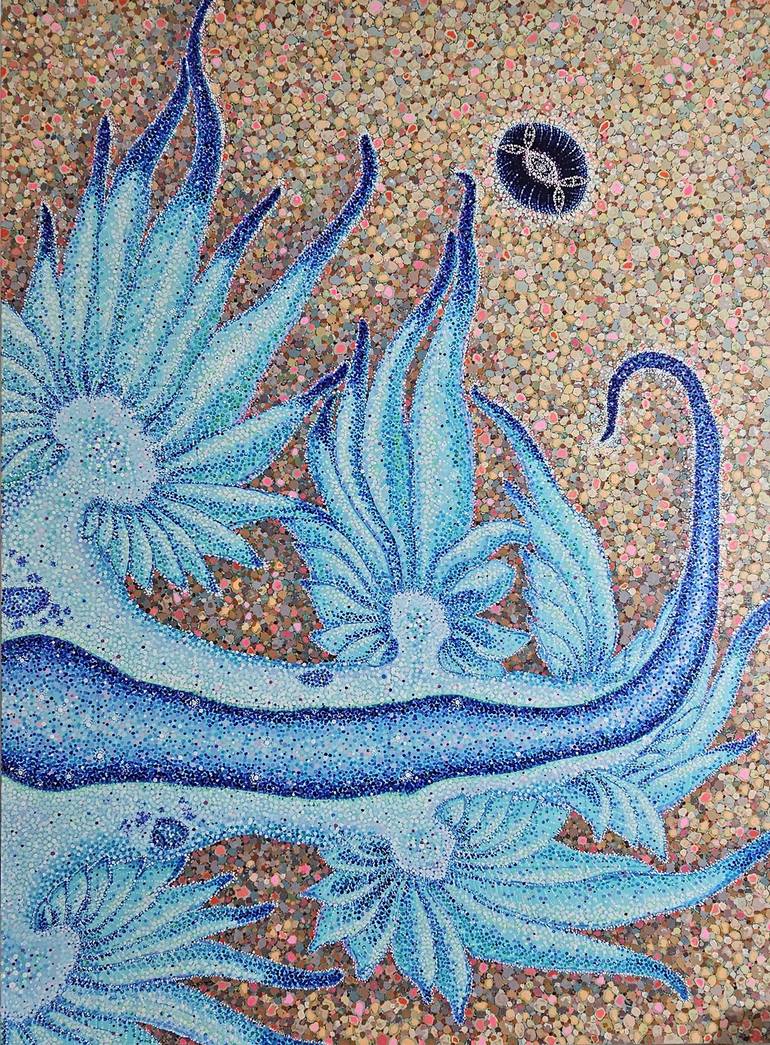 I was inspired by the size of this mollusk. In nature it is half an inch, but in my picture it is two meters. Its beauty is best conveyed in the pointillism style. Sparkling skin consisting of millions of dots. And each dot is a universe.This fantastic sea dragon creature resembles both underwater p...