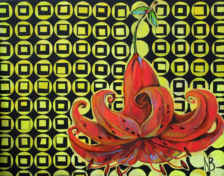 This artwork is an experiment painting realistic flower and abstract ornamental background in bold colors. I used acrylic and touched it up with pastel. Entire painting is varnished with gloss protection for photography effect.
