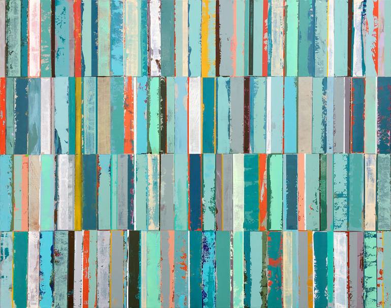 Throughout my career, I have been guided by a deep devotion to experimentation, continually blending mixed-media processes to push the boundaries of my practice. My artistic journey resists easy categorization, evolving through an ongoing exploration of diverse disciplines, subject matter, and materials. This spirit of curiosity carries into my most recent body of work, where I investigate large-scale abstract landscapes through layered, mixed-media techniques that merge intuition with structure. Rooted in a long-standing love of collage and a desire to convey optimism and connection, my compositions are shaped by an intuitive sense of balance, color theory, and textural exploration. Working in a fluid, exploratory manner, I create vibrant abstract color-scapes constructed from found and reclaimed paper ephemera—blueprints, vintage maps, letters, and other fragments of history. These materials evoke a quiet nostalgia tied to my Midwestern upbringing, infusing each work with memory and place. I often build my paintings upon grid-like frameworks, both symmetrical and asymmetrical, which serve as an underlying architecture for the layered elements woven throughout the surface. Each composition develops organically as successive layers of paper and paint are meticulously applied, concealed, and revealed. Patterns, typography, and found objects emerge within intricate arrangements that balance complexity and harmony. The resulting works invite viewers to slow down, look closely, and engage with the evolving surfaces—an intimate tapestry reflecting both my artistic evolution and personal journey.
