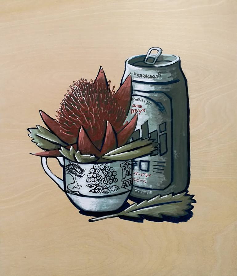 Pitok is a visual artist based in Sydney’s inner west. Having graduated from UNSW Art & Design (formerly the College of Fine Arts, Sydney), he has worked as a Visual Designer and Art Director commercially for the last 20 years. Since 2015 he has been creating personal painted works using gouache. Pitok utilises still life scenes, as a means of enshrining personal objects. These objects are totems that tie us to a time and place. A memory, a person, an experience, a moment we cannot return to that has passed. These still life scenes represent the spaces we construct around us as an extension of our identity. Drawing from the traditions of modernist painters such as Margaret Preston, and ukiyo-e woodblock prints, his works are an exploration of self-identity, a connection with the natural world, and an investigation into Australian and Japanese culture. Pitok works in a studio space at Monster Mouse Studios, an artist collective in Marrickville, Sydney.